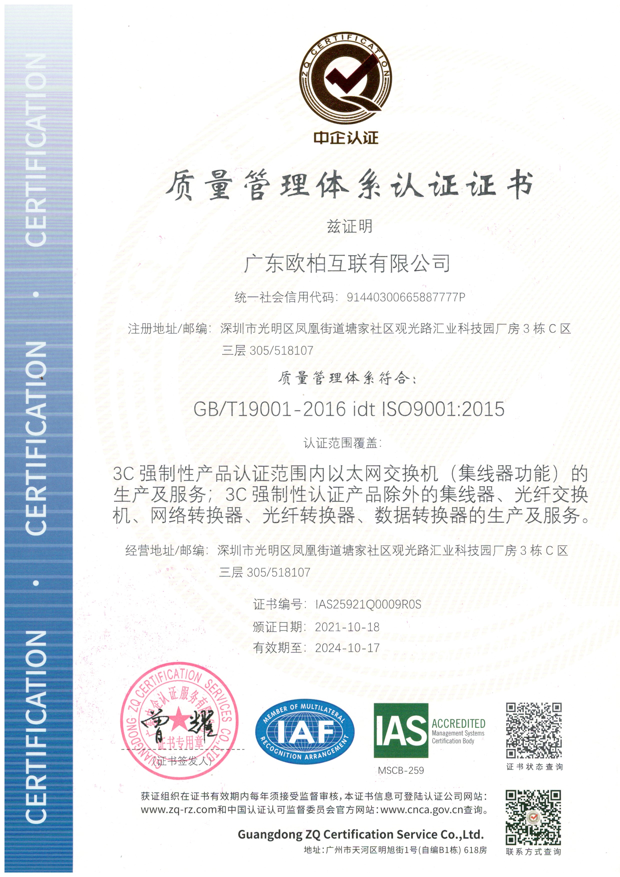 ISO9001體系認證證書