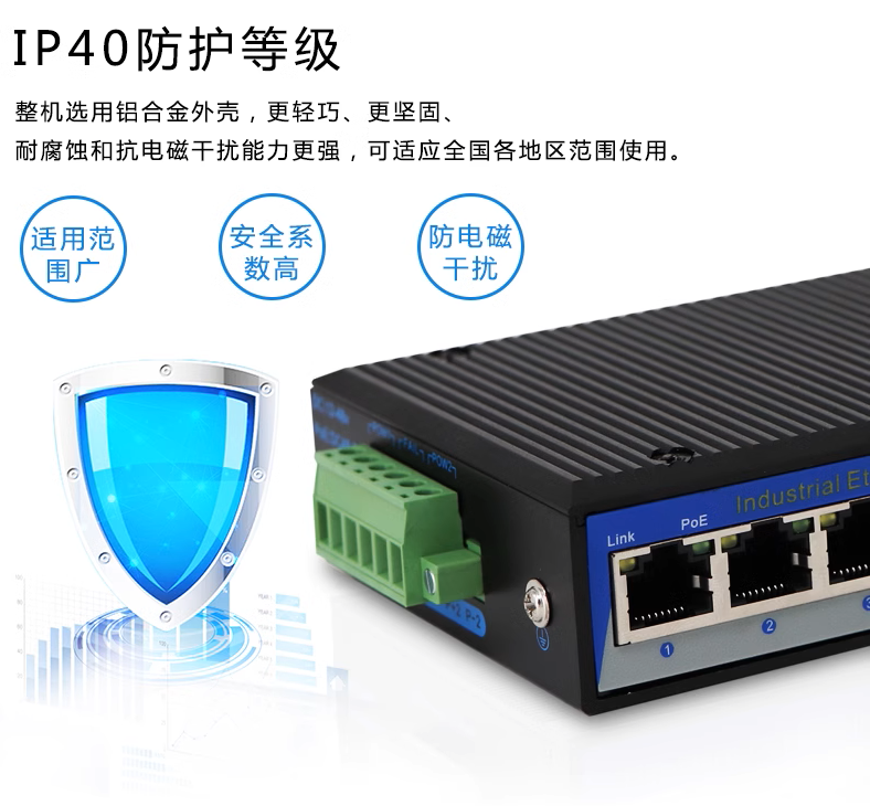 這款交換機擁有著(zhe)黑色的鋁合金外殼,低調而不失豪華,搭配上金屬質感的藍色邊(biān)框,顯得更加穩重與科技感十足。雙電源冗餘設計,支持DC 12V-48V寬直流輸入,保證瞭(le)設備(bèi)的穩定運行。其導軌式安裝方式以及DIN-35标準導軌設計,使其可以輕松地安裝在各種複雜的環境中。更值得一提的是T605F能夠在-40℃~+85℃的苛刻環(huán)境下正常工作,並(bìng)且擁有IP40的防護等級,端口防雷能力高達(dá)5000V,這些特點都充分體現瞭(le)其強大的環境适應性。