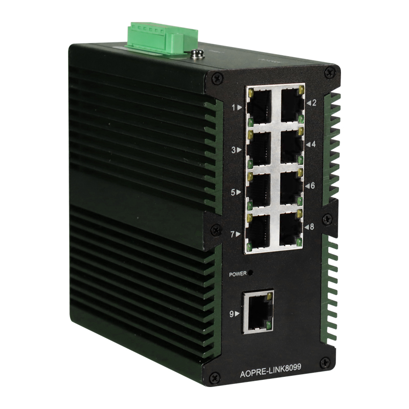 9路千兆電口工業級以太網交換機,支持9個10Base-T/100Base-T/1000Base-TX電口。産(chǎn)品符合FCC、CE、ROHS标準。AOPRE-LINK8099交換機具有-40℃~85℃的工作溫度,具有超強的堅固度能适應各種嚴苛環境,也可以非常方便的安置在空間緊湊的控制箱中。導軌的安裝特性、寬溫操作及擁有IP50防護等級的外殼及LED指示燈,使AOPRE-LINK8099成爲一個即插即用的工業級設備(bèi),爲用戶的以太網設備(bèi)聯網提供可靠、便捷的解決方案。