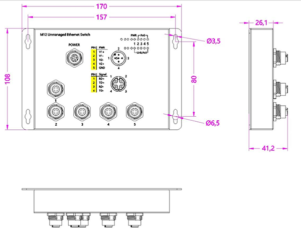 非網管工業級(jí)(鋼(gāng)合金)百兆5電(diàn)M12直插式加固交換機,A型4芯網口,壁挂式-DC12~52V供電(diàn)-寬溫,可帶(dài)POE,默認不含AC電(diàn)源适配器。