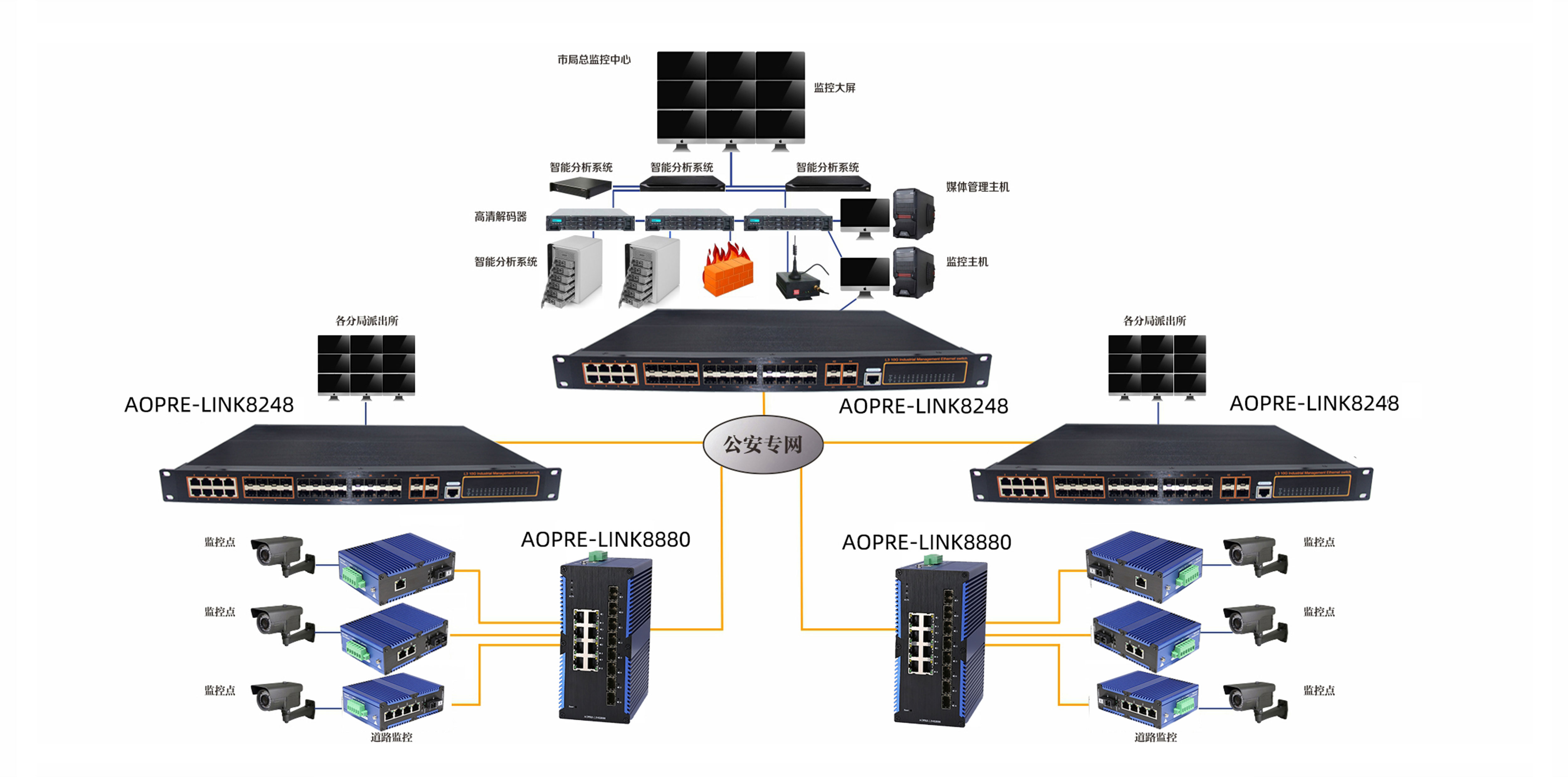 歐柏互聯在解決方案中採(cǎi)用AOPRE-LINK8248、AOPRE-LINK8880、AOPRE-LINK8119、AOPRE-LINK8129、AOPRE-LINK8149根據各個城市安防監控點,安裝定點攝像機,快球,解碼器,報(bào)警探頭等設備,通過光纖将視音信号彙聚到派出所光纖彙聚點,将數字視頻傳送到遠程分局監控中心,保障各個監控點監控到位,提高網絡數據傳輸高效性。