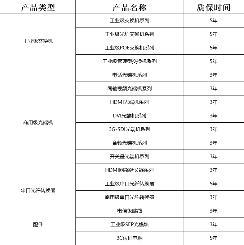 歐柏互聯緻力於(yú)提供高品質的産(chǎn)品和一流的客戶服務。所有産(chǎn)品的出廠保修期爲3年至5年,自交貨之日起生效,在保修期内,我們将維修或更換任何有缺陷的産(chǎn)品,超出保修期的産(chǎn)品将收取維修費用。保修期限根據産(chǎn)品類别有所不同,具體如下所示: